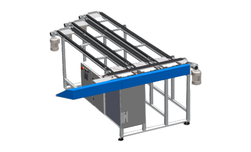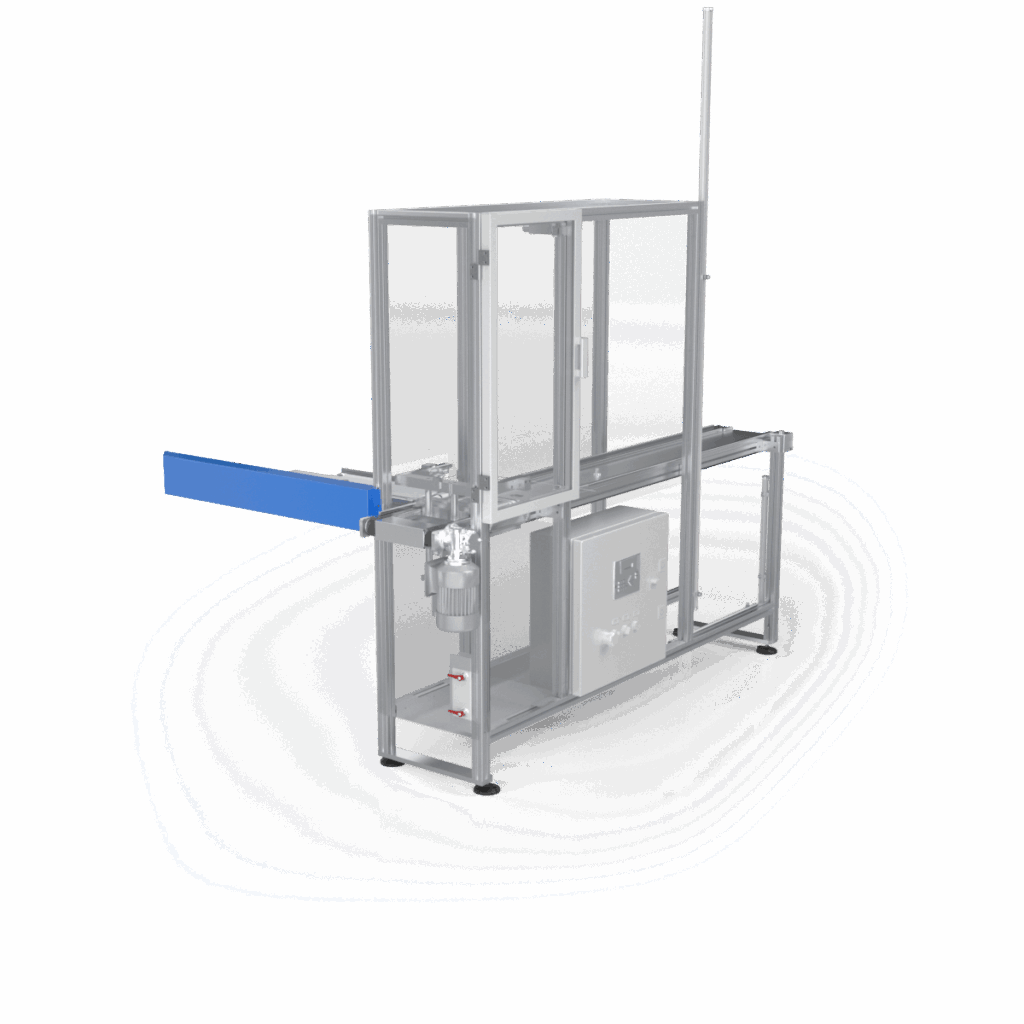 The system is composed of two different devices placed on either side of the machine. Compressed-air devices introduce the trays automatically into the machine for processing.